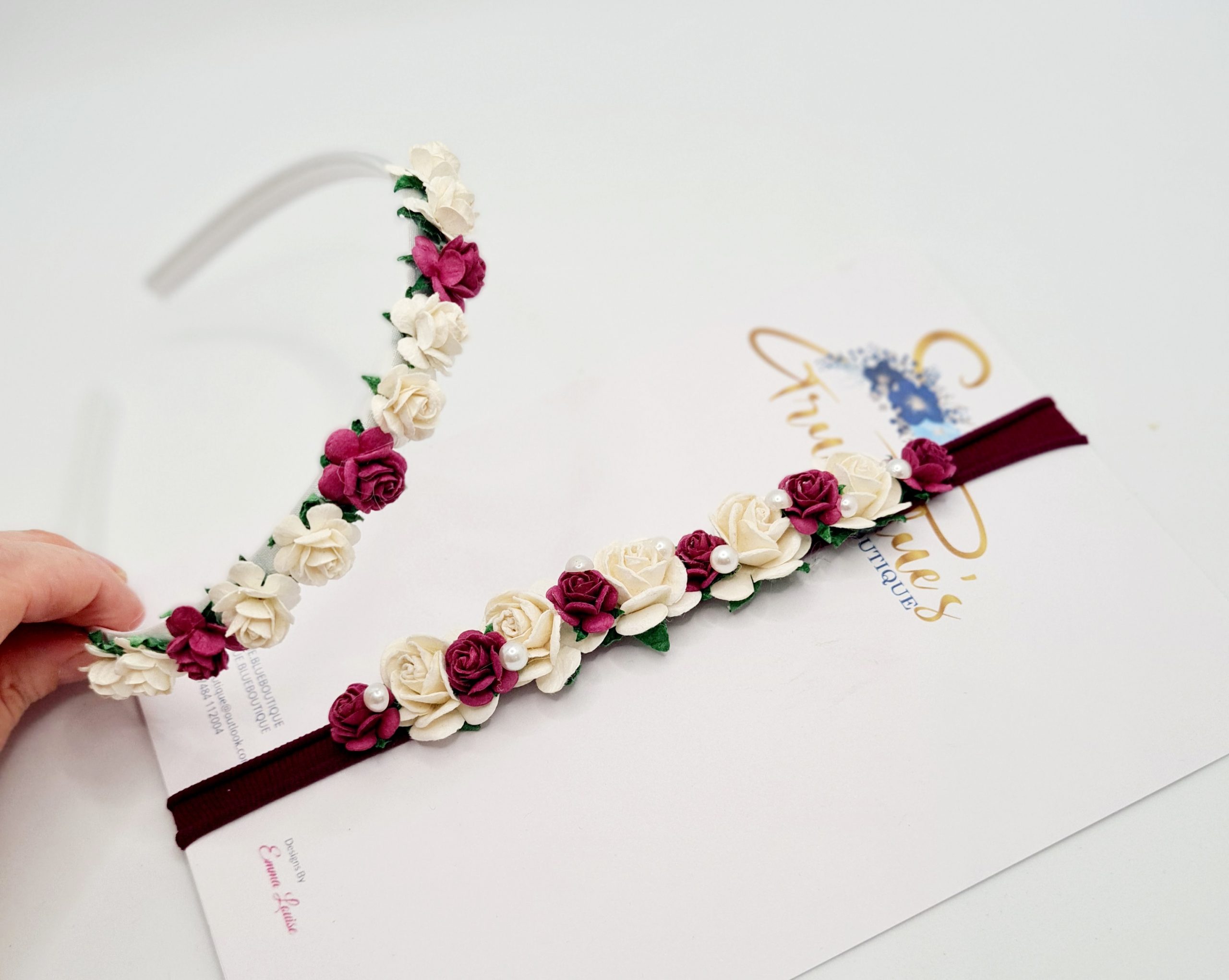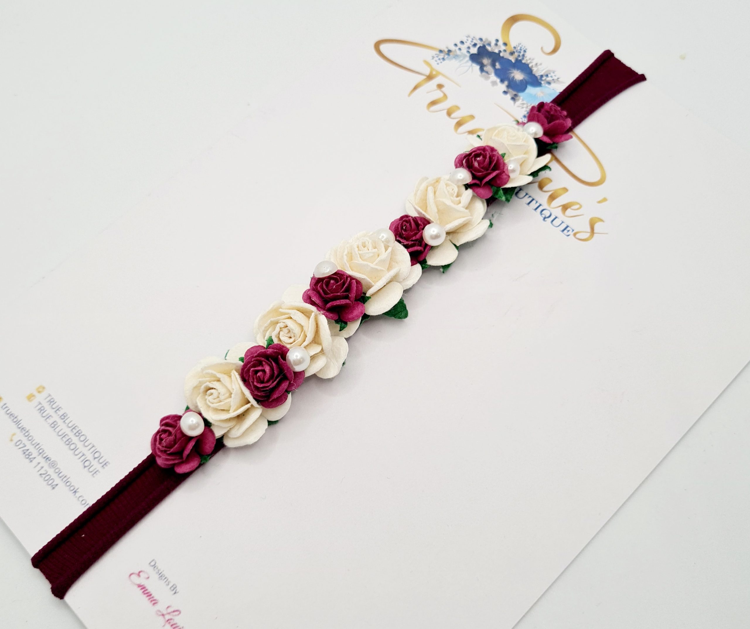 Roisin burgundy & ivory rose pearl nylon hairband quantity