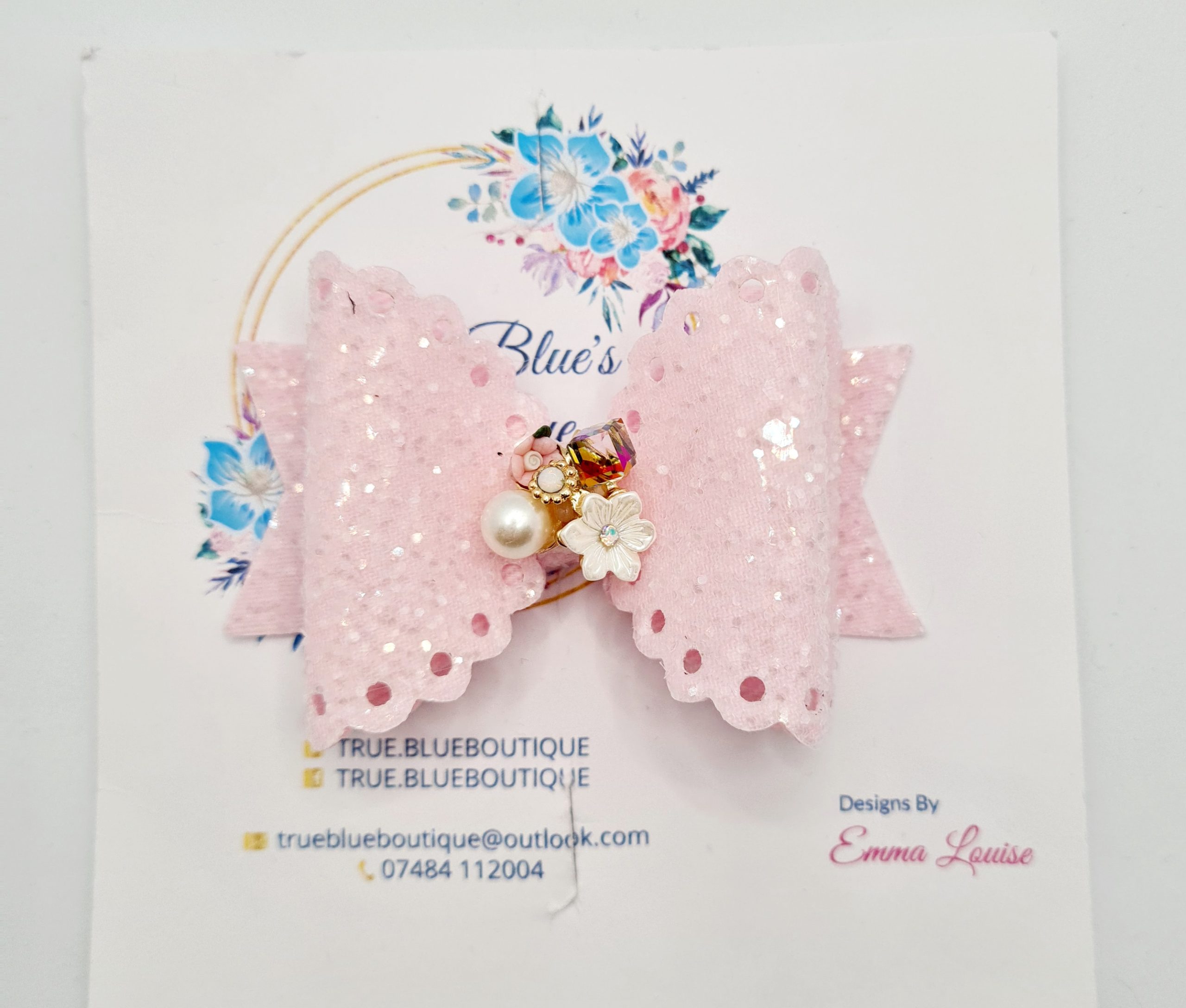 Shimmer glitter pink pearl floral bow 3.5 inch