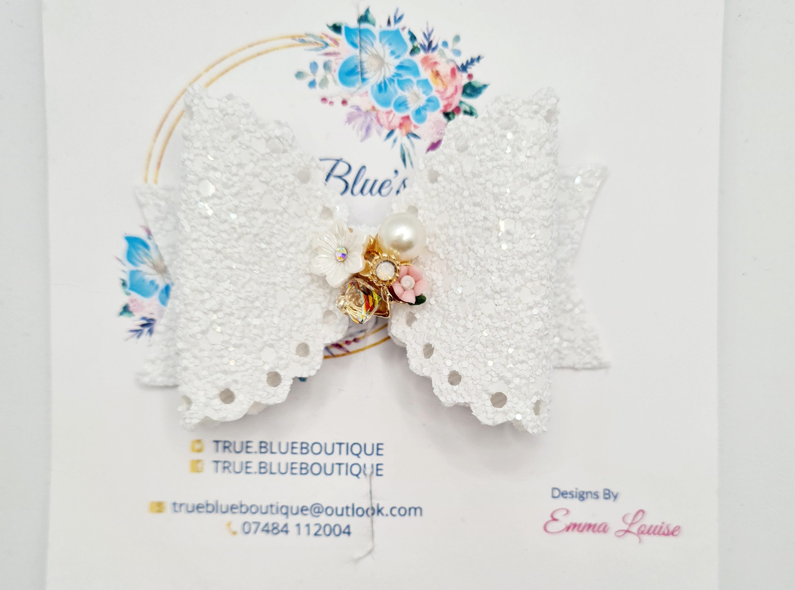 Shimmer glitter white pearl floral 3.5 inch bow